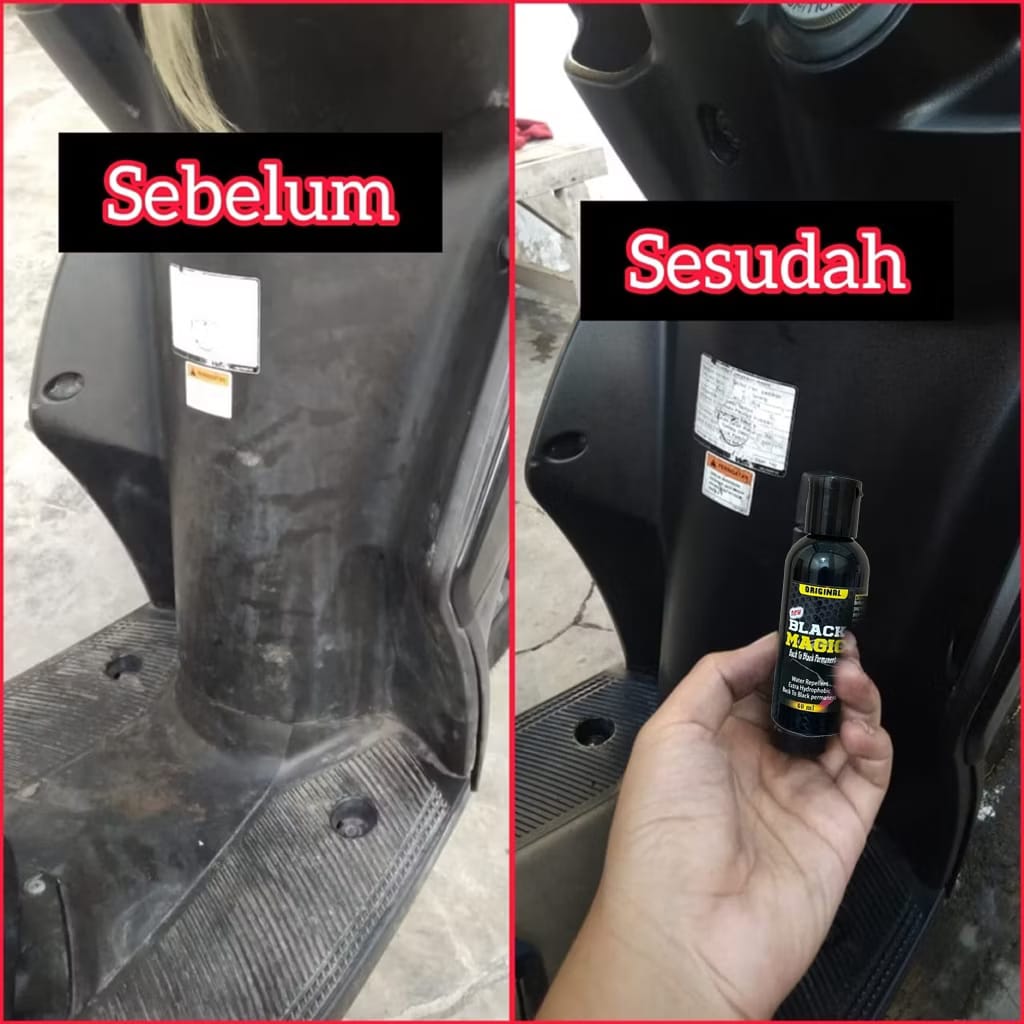Black Magic hadir sebagai solusi perawatan motor yang praktis dan efisien, Black Magic diformulasikan khusus untuk menghitamkan kembali body kasar yang kusam akibat panas, debu, dan pencucian berulang. Dengan tekstur kental dan daya rekat tinggi, produk ini mampu menyerap sempurna ke dalam pori-pori plastik, memberikan hasil kilap alami dan tahan lama.